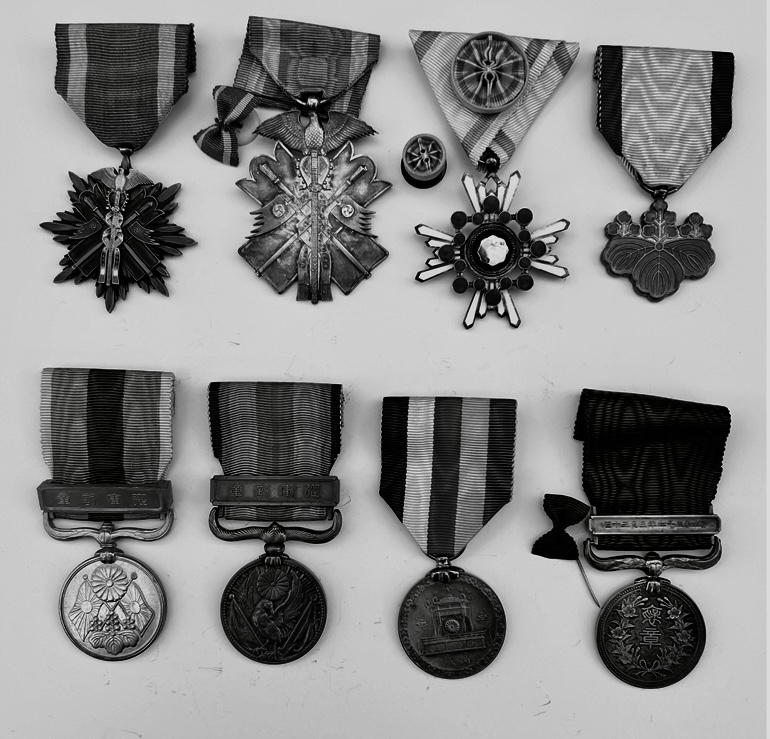J3 | Order of the Sacred Treasure, 4th class in gilt with rosette on ribbon and buttonhole badge. Enamels and jewels intact, in silk lined laquered box of issue. | £150 |